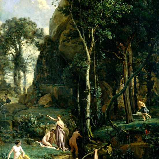 Diana and Actaeon (1836) by Camille Corot depicts the mythological moment when the hunter Actaeon stumbles upon the goddess Diana bathing with her nymphs. Set within a lush, softly lit forest, the scene blends classical narrative with Corot’s poetic landscape style. The tranquil beauty of nature contrasts with the underlying tension of transgression and impending punishment, emphasizing Corot’s gift for atmosphere and lyrical calm.