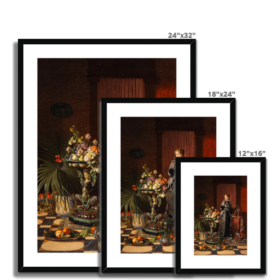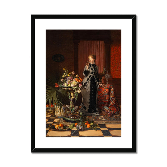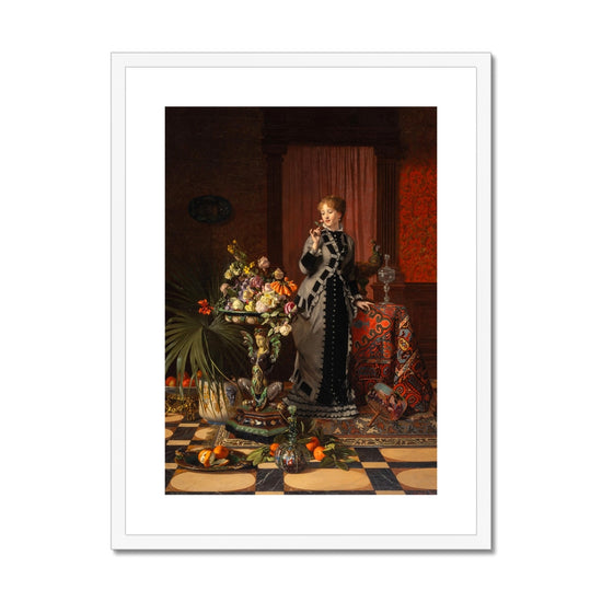 Sie ist von üppigem Dekor umgeben, darunter ein kunstvoller Tisch, geschmückt mit einem großen Blumenarrangement, das eine Vielzahl leuchtender Blumen zeigt. Der Tisch selbst ist ein Kunstwerk, getragen von einem dekorativen Sockel mit einer Skulptur. Der Boden ist mit einem karierten Marmormuster bedeckt, und ein reich gemusterter Teppich verleiht der Szene Wärme. Der Hintergrund ist mit einer tiefroten und goldenen Tapete gestaltet, die die luxuriöse Atmosphäre des Raumes verstärkt. Die Liebe zum Detail bei den Textilien, dem Porzellan und der gesamten Einrichtung unterstreicht das Geschick des Künstlers, den Reichtum und die Eleganz der Oberschicht des 19. Jahrhunderts darzustellen. Das Gemälde strahlt ein Gefühl von Kultiviertheit und Ruhe aus und fängt einen Moment stiller Kontemplation der Dame ein, während sie einen kleinen Gegenstand in ihrer Hand bewundert, möglicherweise ein Schmuckstück oder eine Blume.