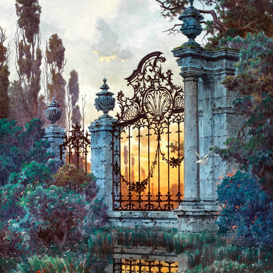 In "Une porte de parc le soir", the French painter Ferdinand Knab (1834–1902) presents a quiet, poetic vision of a park gate at dusk, bathed in the soft glow of the setting sun. The ornate wrought-iron gate and stone pillars stand in gentle silhouette against the warm evening light, while surrounding trees and foliage dissolve into cool, shadowed tones. Reflected in the still water before it, the scene becomes a meditation on atmosphere and transition, capturing the fleeting, melancholic beauty of twilight and the 19th century fascination with mood, light, and quiet solitude.