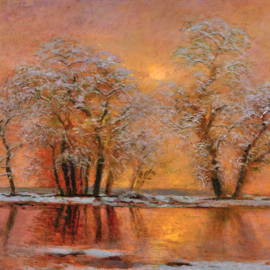 In this atmospheric landscape, László Mednyánszky captures a fleeting moment of light as dusk settles over a quiet, wintery riverside. Bare trees emerge through a veil of glowing golds, rusts, and soft violets, their reflections dissolving into the still water below. Loose, expressive brushwork and a restrained composition shift the focus from topographical detail to mood and sensation. Painted late in the artist’s life, the work reflects Mednyánszky’s enduring preoccupation with transience, solitude, and the subtle emotional resonance of nature at the edge of day.