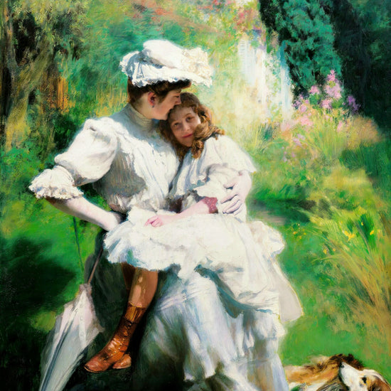 Émile Friants „Mütterliche Zärtlichkeit“ fängt einen ruhigen und intimen Moment zwischen Mutter und Kind ein, getaucht in sanftes, natürliches Licht. In zartes Weiß gekleidet, umarmt die Mutter ihre Tochter, deren Blick Wärme und Geborgenheit ausstrahlt. Die üppige Gartenkulisse, gemalt mit impressionistischen Pinselstrichen, verstärkt die idyllische und friedliche Atmosphäre. Friant verbindet meisterhaft Realismus mit traumhafter Sanftheit und erinnert so an die Tiefe mütterlicher Liebe und die flüchtige Schönheit der Kindheit.