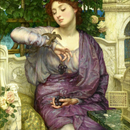 This refined classical subject draws on Catullus’s ancient poem of love and loss, portraying Lesbia in a moment of quiet intimacy as she gently toys with her pet sparrow. Poynter’s luminous handling of colour, rich textures, and idealised form reflects the academic classicism of the late Victorian era, while the lush garden setting evokes both sensual pleasure and poetic melancholy. The painting unites classical literature with Edwardian elegance, offering a contemplative meditation on affection, beauty, and transience.