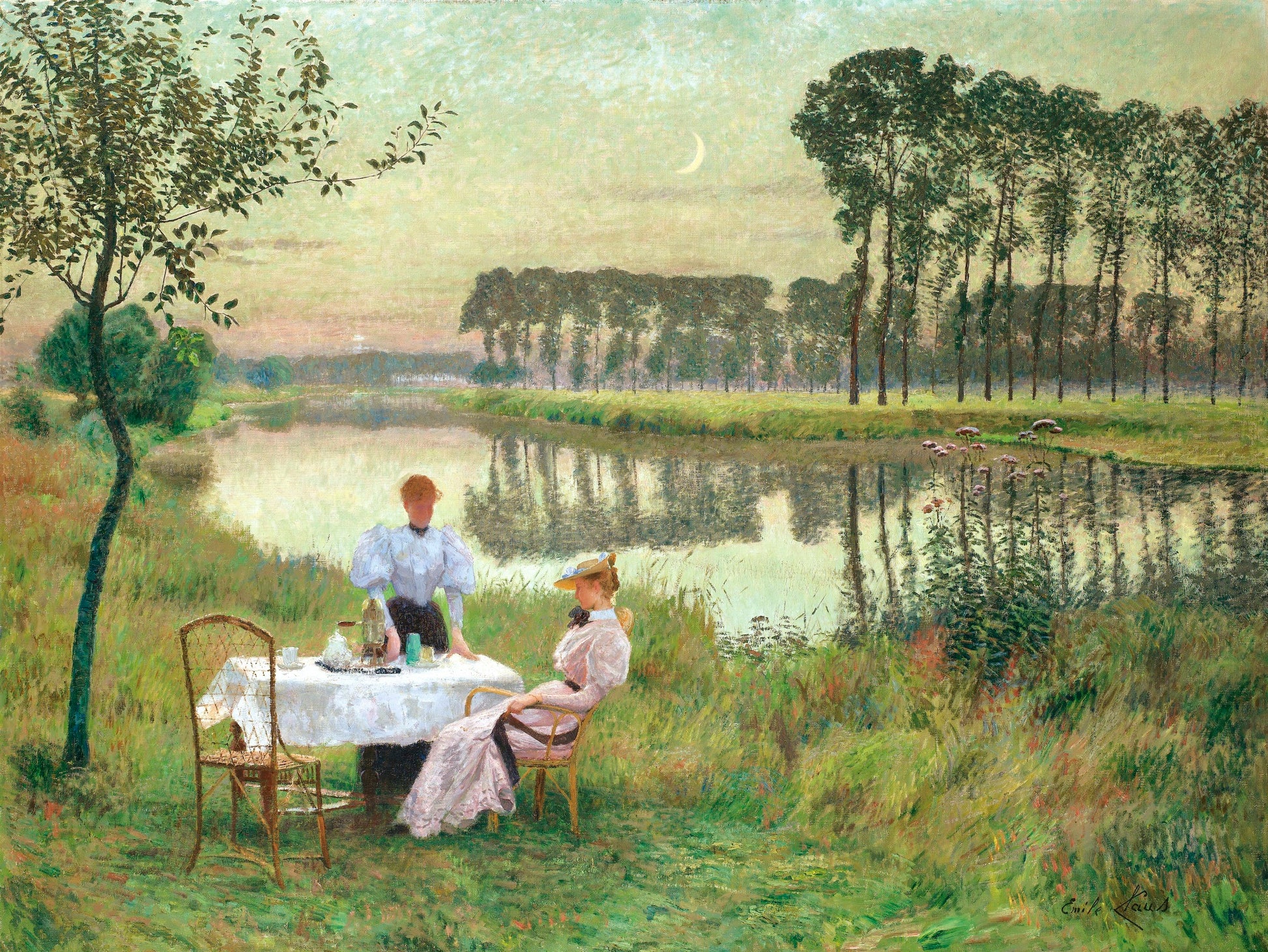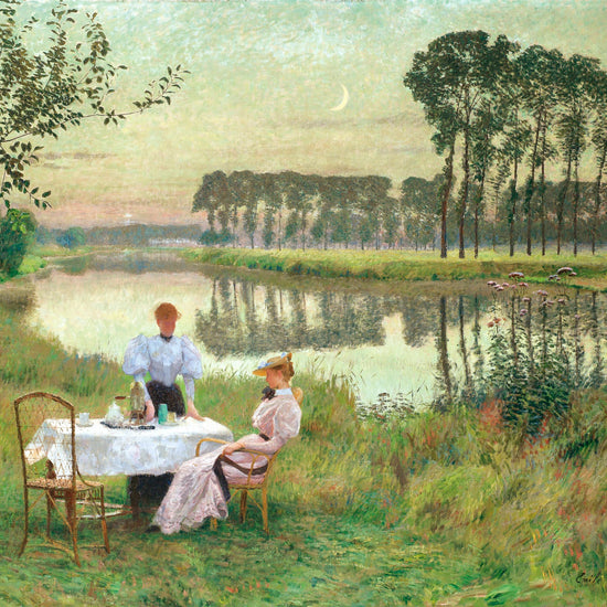 "Summer Evening" (1895) by Emile Claus is a serene Impressionist scene depicting two women enjoying tea by a tranquil river at dusk. Bathed in soft twilight, the composition captures the fading light of a crescent moon sky, with tall poplars mirrored in the calm water. The lush greenery and gentle reflections evoke a quiet, idyllic moment of leisure in the Belgian countryside.