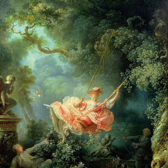 The Swing (1767) by Jean-Honoré Fragonard is a quintessential example of Rococo art, celebrated for its playful elegance and romantic frivolity. Set within a lush, overgrown garden, the scene captures a young woman in a billowing pink dress soaring on a swing, propelled by an unseen older man. Her shoe flies off mid-air as she coyly looks down at a hidden admirer lying in the bushes below—creating a scene rich in sensuality, mischief, and light-hearted abandon. Fragonard’s masterful use of soft lighting, intricate detail, and delicate brushwork enhances the dreamlike atmosphere and luxurious mood of 18th-century aristocratic leisure.