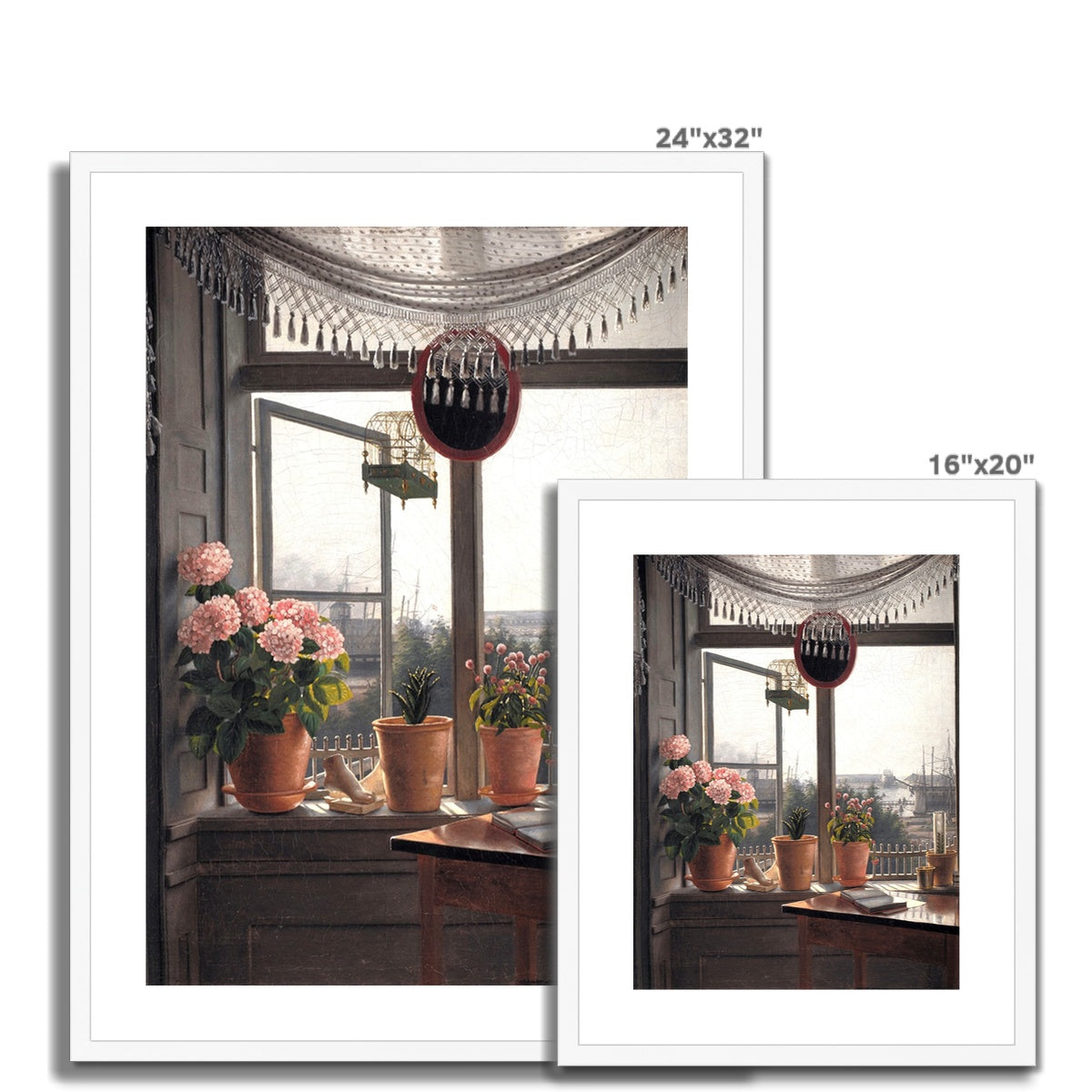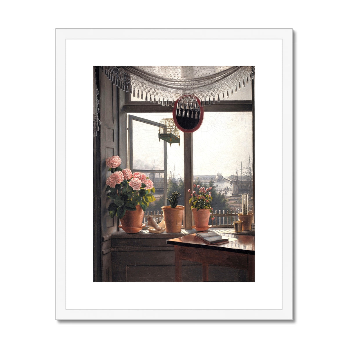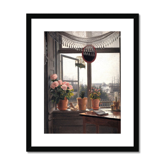 „Blick aus dem Fenster des Künstlers“ von Martinus Rørbye, um 1825, ist eine detaillierte und heitere Darstellung eines häuslichen Interieurs mit Blick auf eine maritime Szene. Der Künstler befindet sich in einem gemütlichen Raum, dessen Fensterbank mit Topfpflanzen – leuchtend rosa Hortensien, einer Sukkulente und einer weiteren blühenden Pflanze – geschmückt ist, die sorgfältig in Terrakottatöpfen platziert wurden. Die Anordnung der Blumen verleiht dem Raum ein Gefühl von Wärme und Leben.