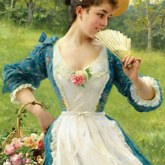 In Young Beauty with a Basket of Roses, Frederico Andreotti (1847–1930) presents a graceful young woman strolling through a sunlit meadow, her figure animated by a light, elegant gesture as she holds a fan and carries a basket of freshly gathered roses. Rendered with delicate brushwork and a luminous palette, the painting celebrates youthful charm, refinement, and the gentle pleasures of an idealized rural idyll, capturing a moment of effortless beauty and quiet, decorative harmony.
