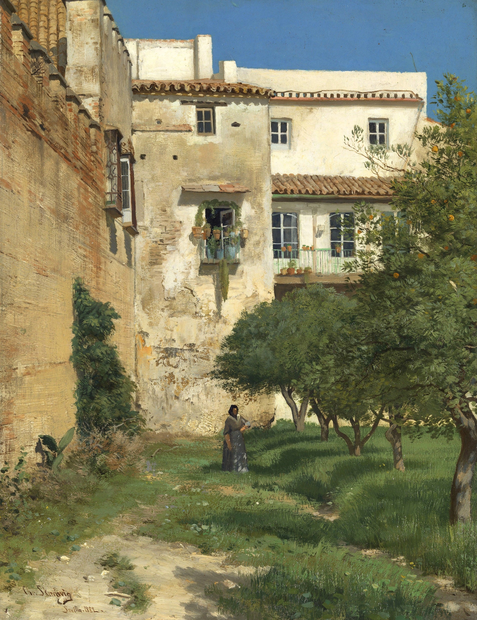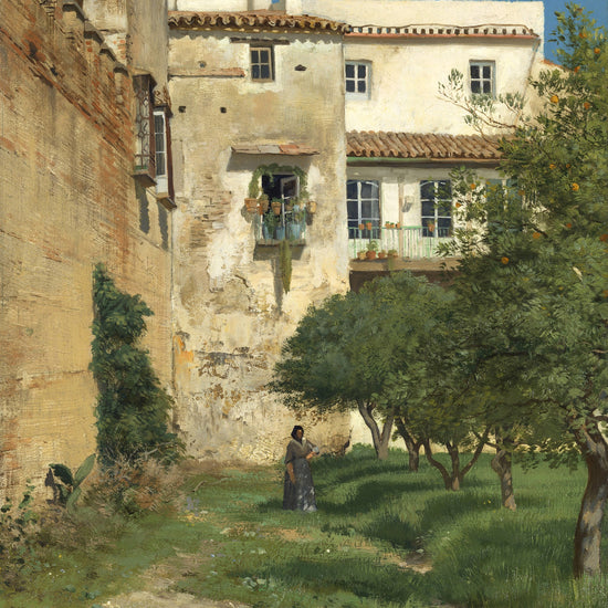 « Sevilla » (1882) de Christian Skredsvig capture une scène sereine dans une cour intérieure baignée d'une chaude lumière. Le tableau représente un vieux bâtiment rustique aux murs patinés par le temps et aux balcons plantés de plantes en pot, sur fond de ciel bleu azur. Une femme solitaire en costume traditionnel se promène dans un jardin verdoyant et luxuriant, bordé d'orangers. La composition allie charme architectural et tranquillité naturelle, évoquant l'atmosphère paisible d'une journée tranquille à Séville.