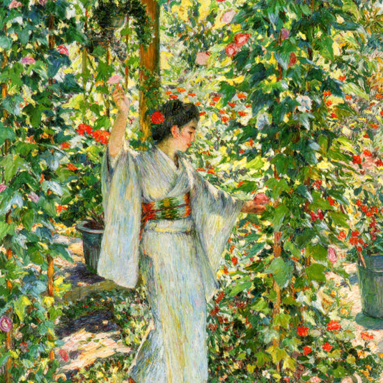 Morning Glories (1918) by Torajirō Kojima (1881–1929) depicts a young woman in a light kimono tending a lush trellis of blooming flowers in a sunlit garden. Painted with vibrant, impressionistic brushwork, the scene shimmers with colour and movement as light filters through leaves and blossoms. The work beautifully blends Japanese subject matter with Western painterly technique, creating a serene and poetic meditation on nature, everyday ritual, and quiet elegance.