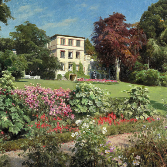 Ce tableau de 1934 de l'artiste danois Peder Mørk Mønsted, intitulé « Vue du parc de Sophienholm, Kongens Lyngby », capture une scène estivale sereine dans un jardin luxuriant. La majestueuse villa de Sophienholm se dresse en arrière-plan, entourée de parterres de fleurs éclatants, de grands arbres et de pelouses impeccables. Le souci du détail et de la lumière, caractéristique de Mønsted, restitue la beauté naturelle du paysage avec une précision et une sérénité réalistes.