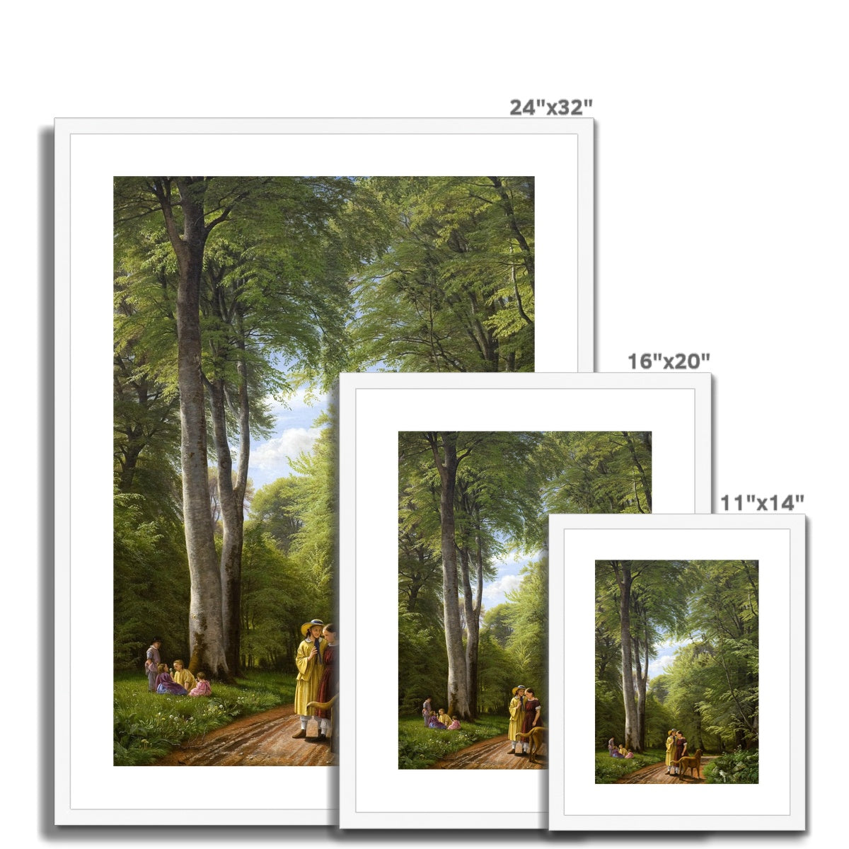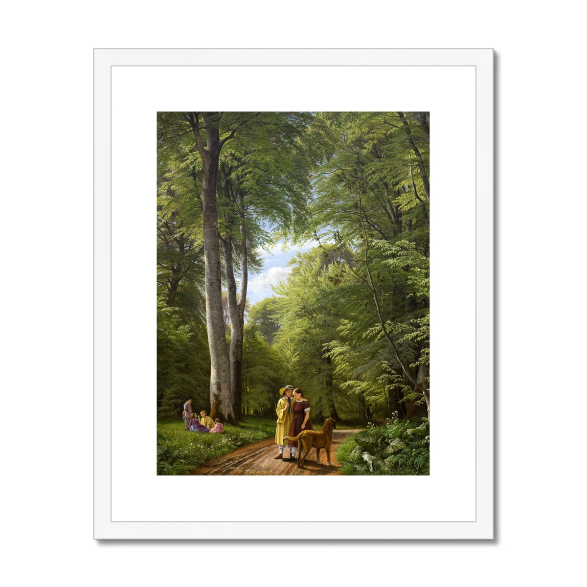 This painting by P.C. Skovgaard, titled A Beech Wood in May near Iselingen Manor, Zealand (1857), captures a serene springtime scene in a lush Danish forest. The composition showcases towering beech trees, their dense, fresh green foliage forming a vibrant canopy overhead. Sunlight filters through the leaves, creating a peaceful ambiance. In the foreground, a group of people, including two women accompanied by a dog, walk along a dirt path, while another group sits in a meadow nearby, adding a gentle human presence to the natural landscape. Skovgaard's attention to detail and use of light highlights the tranquil beauty of the woodland.