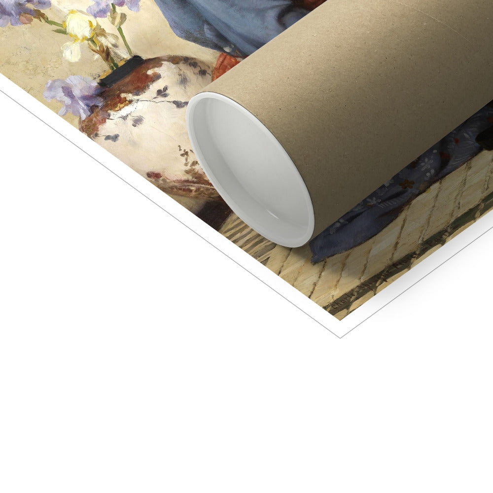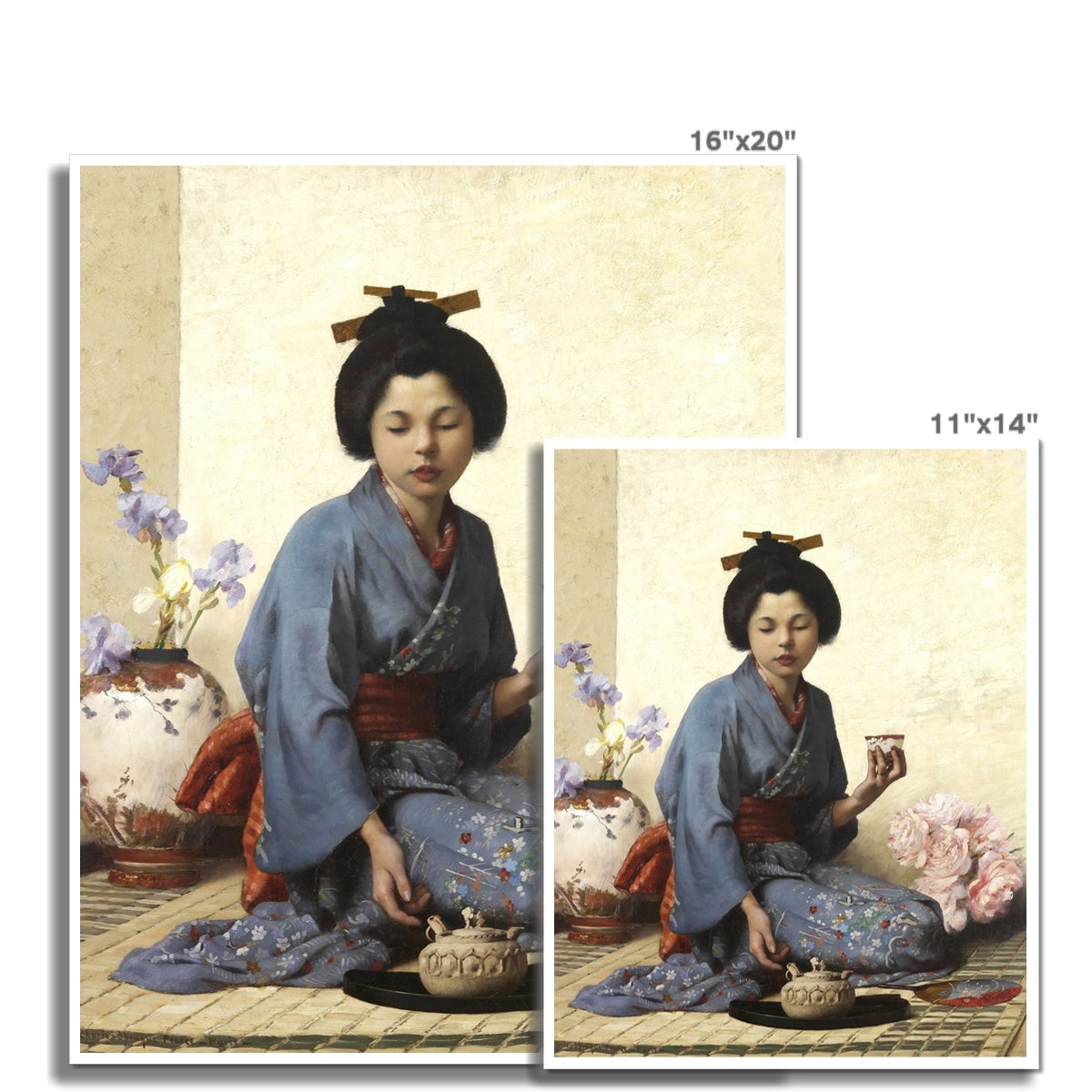 "A Cup of Tea" (1883) by Charles Sprague Pearce presents a refined and serene portrayal of a Japanese woman in a richly adorned blue kimono, seated gracefully as she delicately holds a tea bowl. The composition captures an intimate moment within the cultural ritual of tea drinking, exuding calm and quiet sophistication. Soft, naturalistic light highlights the textures of the fabric, the floral patterns, and her serene expression. The harmonious arrangement of flowers, pottery, and subtle details reflects Pearce's sensitivity to both cultural context and aesthetic beauty, showcasing the influence of Japonisme in 19th-century Western art.