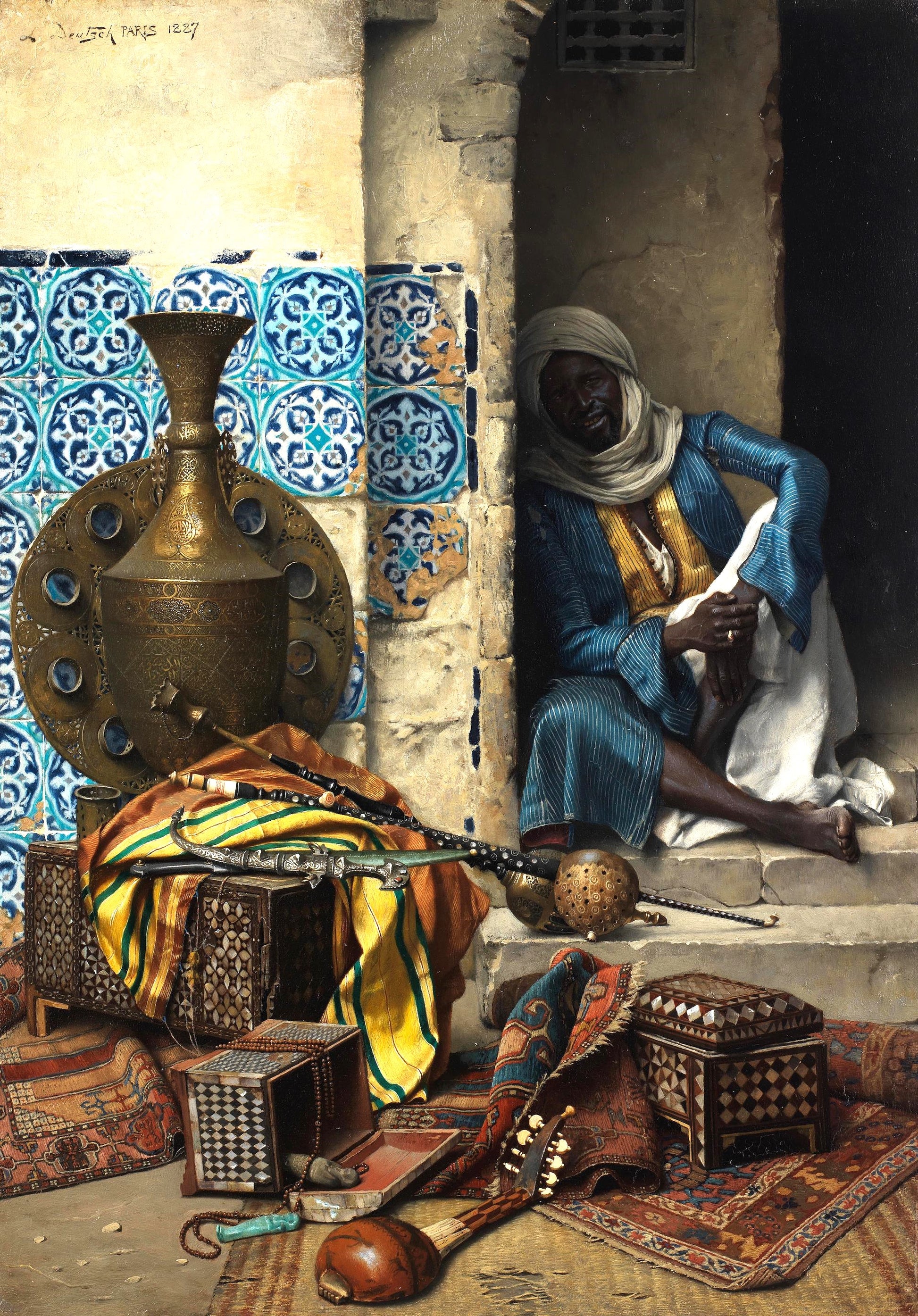 "A Dealer in Artefacts" (1887) by Ludwig Deutsch portrays a scene of intricate detail and rich textures. Set in an exotic location, likely North Africa or the Middle East, it features a seated man in traditional attire, resting in a shadowed doorway. Surrounding him are a variety of ornate objects, including a decorative brass vessel, patterned fabrics, and wooden boxes with geometric inlay designs, which suggest luxury and craftsmanship. The background includes vibrant blue and white ceramic tiles, adding to the ambiance. Deutsch’s use of light and shadow enhances the realistic quality, while the items emphasize the allure of foreign artistry in Orientalist art.
