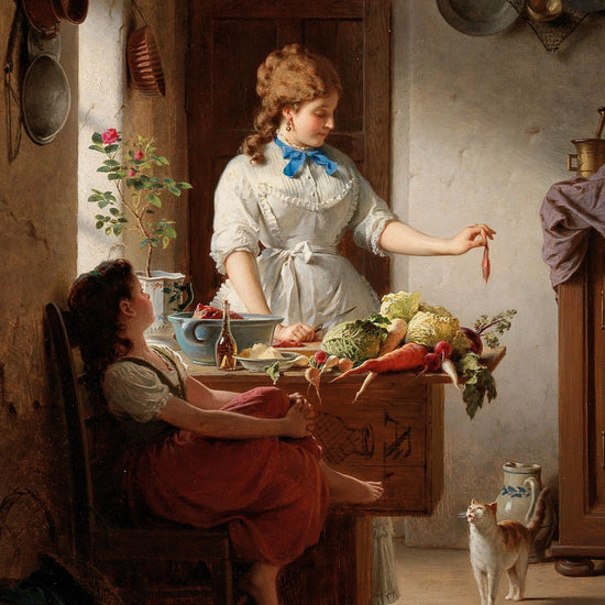 Anton Ebert – A Kitchen Idyll (1873). This charming domestic scene by Anton Ebert captures a tranquil moment of everyday life in a rustic kitchen. Bathed in gentle daylight, two young women prepare vegetables as a cat waits expectantly at their feet. Ebert’s meticulous attention to detail—from the textures of the produce to the soft interplay of light on fabric and pottery—imbues the composition with warmth and intimacy. The work reflects 19th-century genre painting’s celebration of simplicity, harmony, and the quiet beauty of domestic labor.