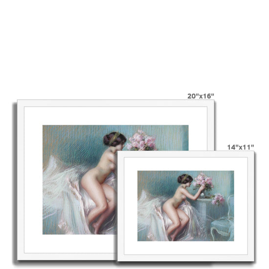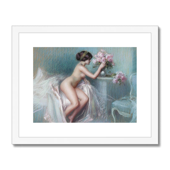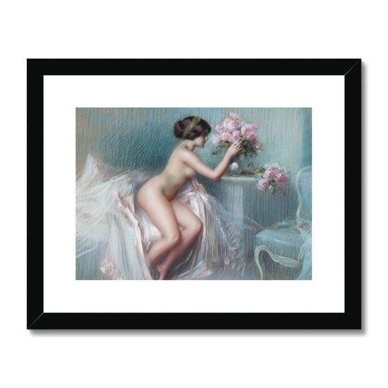 Delphin Enjolras' painting Arranging Summer Blooms beautifully depicts a graceful woman seated beside a table, delicately arranging a bouquet of pink flowers. Rendered in soft pastels, the artwork captures the woman's nude form with elegance, draped lightly in sheer fabric that cascades around her. The scene is bathed in a soft, diffused light that enhances the gentle, romantic ambiance, highlighting the delicate tones of her skin and the blooms. Enjolras' refined use of light and colour creates an intimate, serene atmosphere, celebrating femininity and beauty in a graceful, almost ethereal manner.