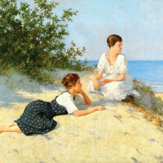 Bathed in soft coastal light, Hermann Seeger’s Baltic Sea Shore captures a tranquil moment of leisure by the sea. Two young women rest upon sunlit dunes, their relaxed poses and gentle gazes evoking the calm rhythm of a summer afternoon. With delicate brushwork and a serene palette of blues, whites, and golds, Seeger conveys the quiet harmony between human presence and the natural beauty of the northern coast.