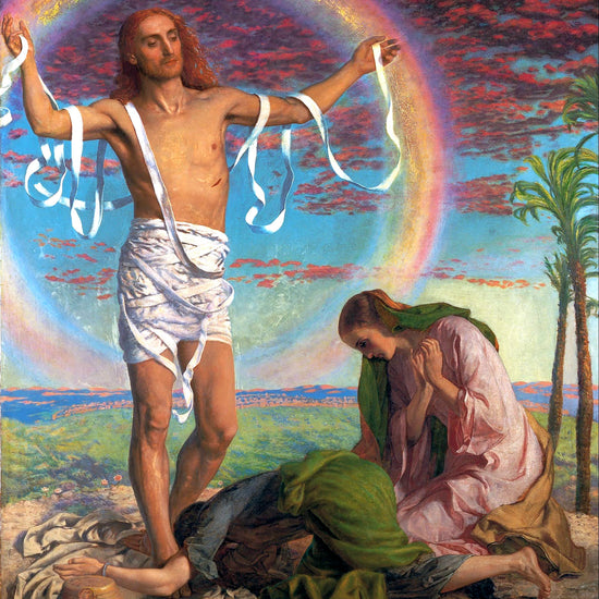 Christ and the Two Marys (1847) by William Holman Hunt presents a radiant vision of the Resurrection, imbued with symbolic color and spiritual intensity. Against a luminous dawn sky, Christ stands triumphant yet compassionate, encircled by a halo of divine light, while Mary Magdalene kneels in awe and devotion at his feet. Through meticulous detail, vivid hues, and emotional realism, Hunt conveys both the transcendence of faith and the profound human encounter with the divine mystery of renewal and hope.