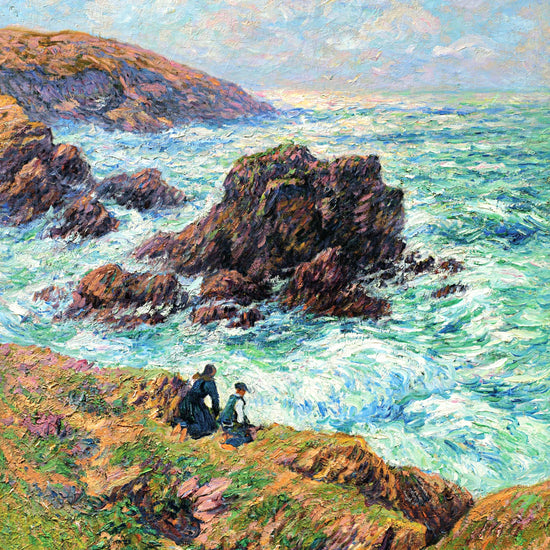 Henry Moret (1856–1913) – Côte de Clohars, Finistère (1908). In this vibrant coastal scene, Henry Moret captures the rugged beauty of Brittany’s shoreline with luminous impressionist brushwork. Two figures stand on a grassy cliff overlooking the restless sea, their dark silhouettes contrasting with the sunlit waves below. The dynamic interplay of turquoise, violet, and golden tones evokes both the power and serenity of the Atlantic landscape. Moret’s masterful handling of light and texture transforms this moment of quiet observation into a celebration of nature’s movement, colour, and enduring vitality.