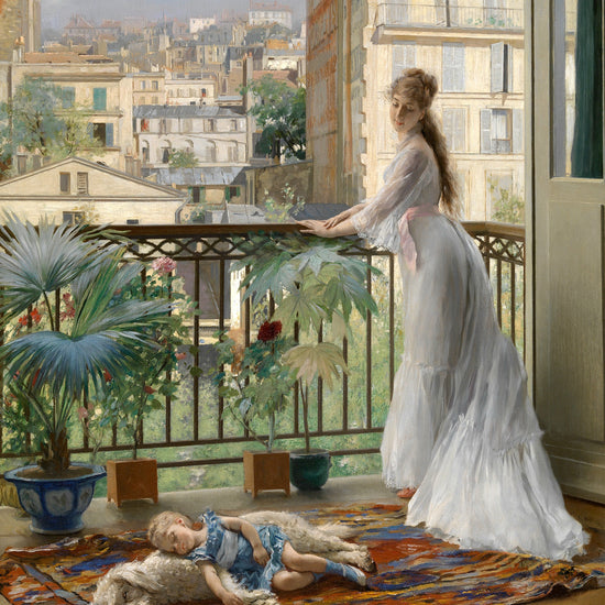 Dreamy (circa 1877) by Gustave Léonard de Jonghe presents an exquisitely rendered vision of domestic tranquility and refined bourgeois life. A young woman, dressed in a flowing white gown, leans gracefully against a balcony, her gaze directed toward the sunlit expanse of Parisian rooftops. In the foreground, a child lies peacefully asleep upon a richly patterned oriental rug, nestled beside a faithful dog. De Jonghe’s meticulous attention to detail, masterful handling of light, and delicate sense of composition imbue the scene with both elegance and quiet intimacy, evoking a timeless atmosphere of reverie and repose.
