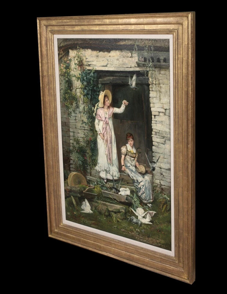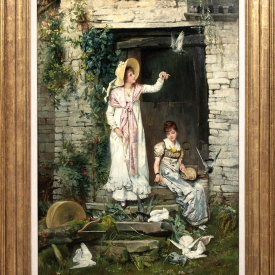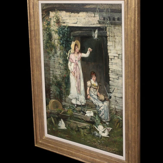 A large and finely executed 19th-century English genre painting depicting two young women feeding birds beside a weathered cottage, oil on canvas. Charlotte J. Weeks renders the scene with meticulous detail, graceful figuration, and a gentle luminosity characteristic of Victorian sentiment. The full-length figures, dressed in light summer attire, are portrayed with a naturalistic elegance that reflects the influence of the Pre-Raphaelite movement. The work remains in excellent condition throughout and is signed lower right.