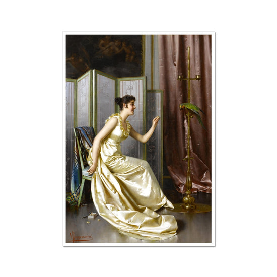 This fine art print from 19th century Italian master Vittorio Reggianini captures the beauty and detail of the a feeding parrot. Reggianini was known for his expertise in conveying the emotion of his subject and this print is no exception.