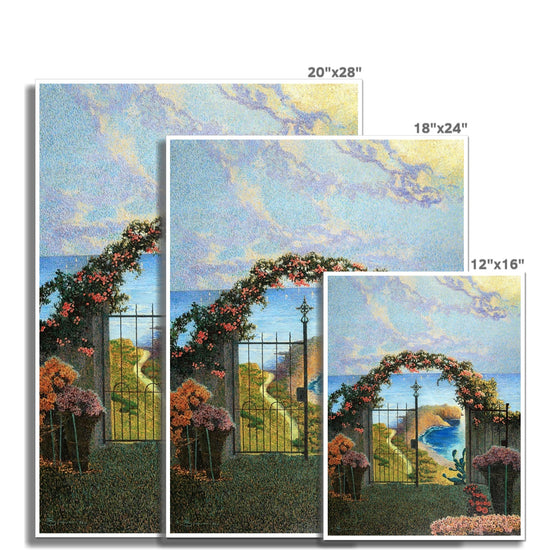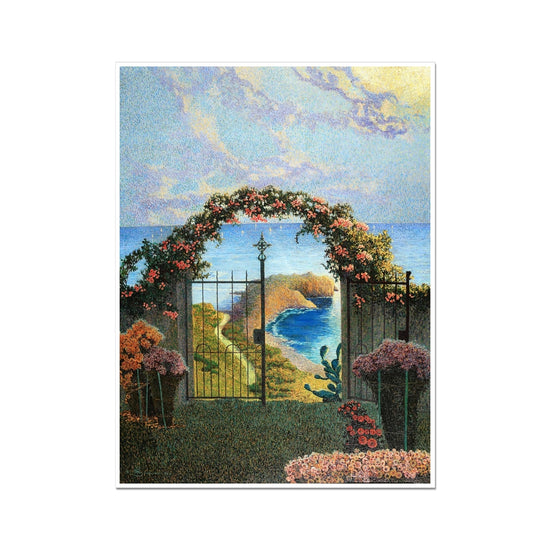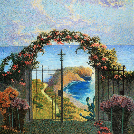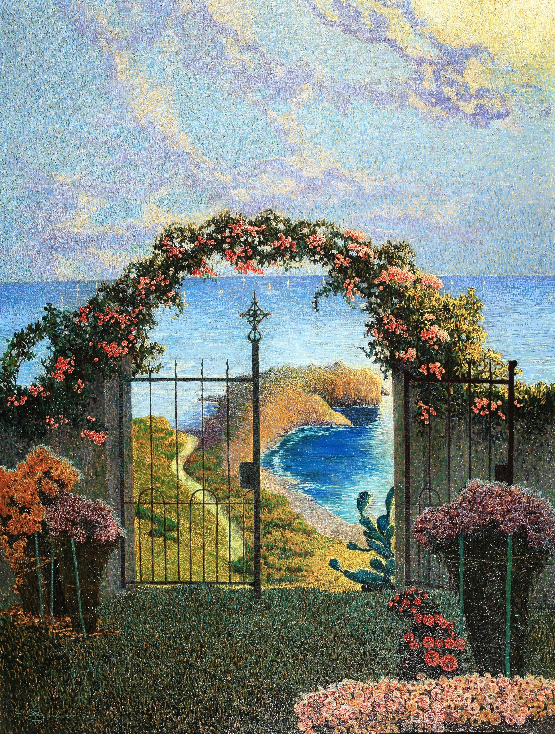 "Flowering" by Ernesto Barbero, created around 1922, is an enchanting oil painting that captures a breathtaking view of a coastal landscape through an ornate garden gate. The gate is adorned with a lush, blooming arch of pink and red flowers, leading the viewer's eye to the scenic vista beyond. Beyond the gate, a winding path descends towards a picturesque bay, surrounded by verdant cliffs and the azure sea. The foreground is filled with meticulously detailed flowers and greenery, creating a vivid and colorful contrast with the tranquil seascape in the background. The sky is dotted with soft, pastel clouds, enhancing the idyllic and serene atmosphere of the scene. The pointillist technique used by the artist adds a vibrant and textured quality to the painting, emphasizing the beauty and tranquility of the natural setting.