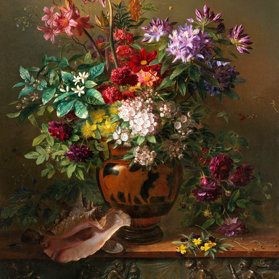Flowers in a Greek Vase (1817) by Georgius Jacobus Johannes van Os is a masterful still-life that blends botanical precision with classical elegance. A lavish arrangement of blossoms—rendered with luminous color and meticulous detail—overflows from an antique Greek vase adorned with mythological figures. The polished shell, scattered blooms, and sculptural frieze below enhance the composition’s harmony, showcasing van Os’s virtuosity and the era’s fascination with both natural beauty and antiquity.