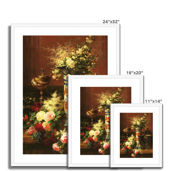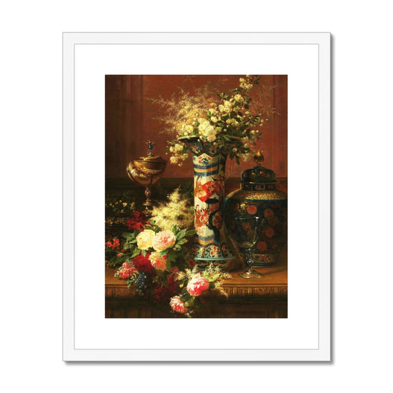 This painting, titled Flowers in a Japanese Vase by Jean-Baptiste Robie, was created around 1870. It showcases an elegant still life arrangement featuring a tall, ornate Japanese vase filled with delicate white blossoms. Surrounding the vase are lush, vividly colored flowers, including pink and yellow roses, skillfully arranged on a wooden surface. The painting also includes decorative objects, such as a gold goblet with intricate details and a smaller, richly patterned vase, enhancing the scene's opulent feel. Robie’s attention to detail and the rich textures of the flowers and objects create a sense of luxury and refinement, capturing the 19th-century fascination with exotic artifacts and floral beauty.