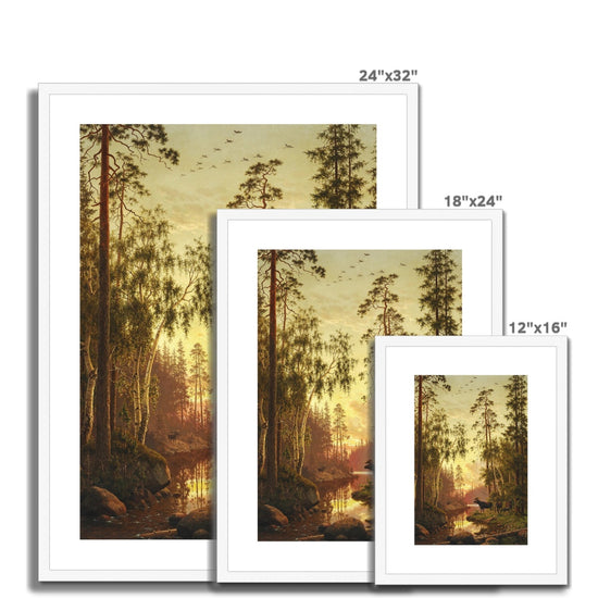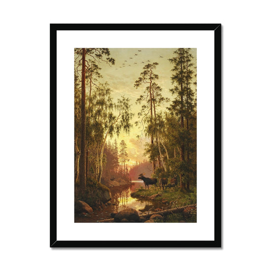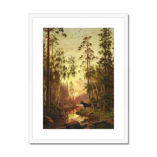 "Forest Scene with Elks" by Carl Bøgh, circa 1879, is a beautifully detailed depiction of a serene woodland landscape at either dawn or dusk, as indicated by the warm, golden light that suffuses the scene. The forest is dense with tall, towering trees, mainly birches and pines, framing a small, reflective stream that leads to a calm lake in the background. The light filtering through the trees enhances the peaceful atmosphere, casting soft reflections on the water.