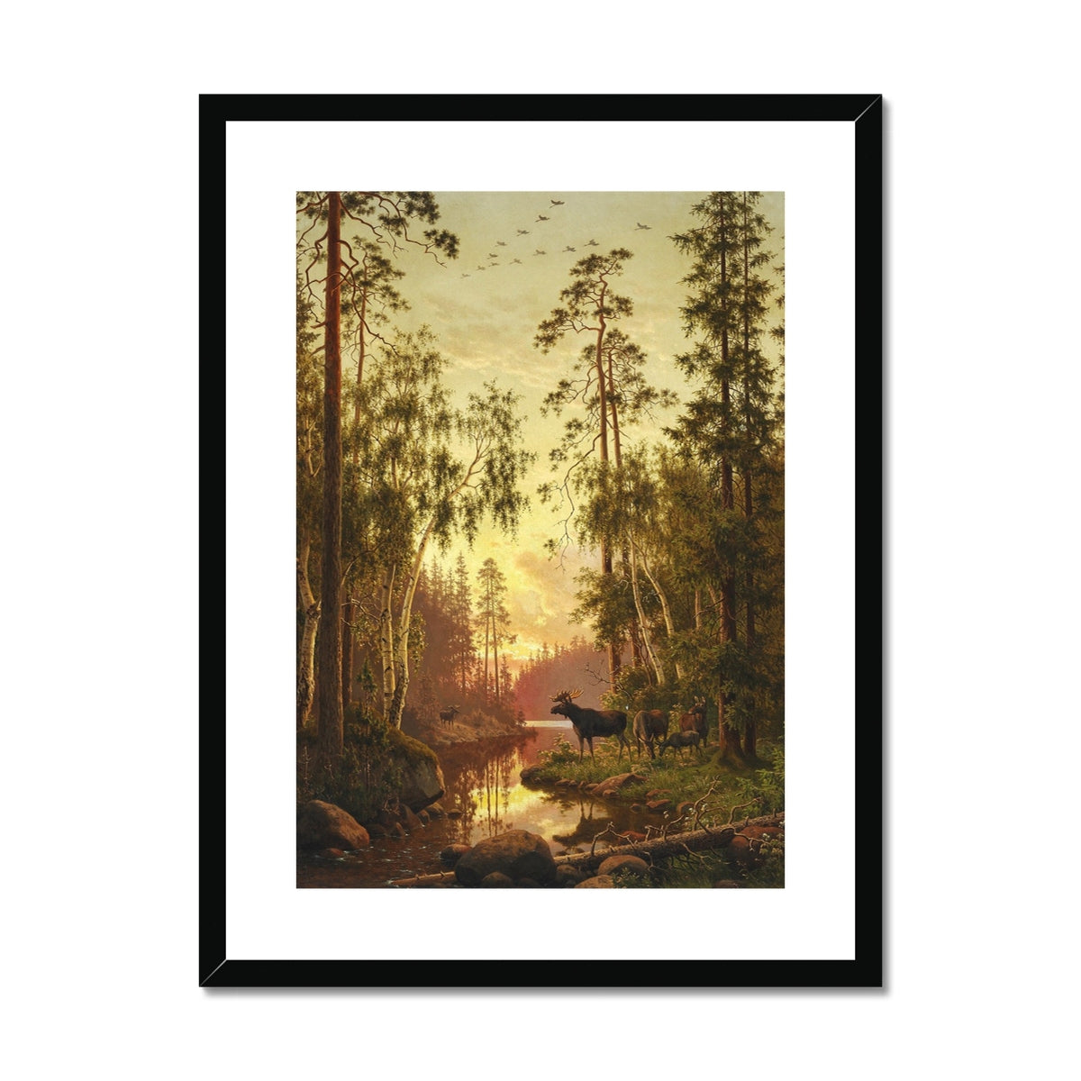 In the foreground, a group of majestic elks stands by the water's edge, with a bull elk taking center stage, its large antlers adding a sense of grandeur to the scene. Other elks graze nearby, while a few more can be seen in the distance. Above, a formation of birds flies across the sky, adding a sense of movement and connection to the broader landscape. Bøgh's attention to the fine details of the natural surroundings—the texture of the bark, the lush greenery, and the quiet water—creates a harmonious and idyllic portrayal of wildlife in its natural habitat. The composition emphasizes the beauty of nature and the peaceful coexistence of animals in this unspoiled environment.