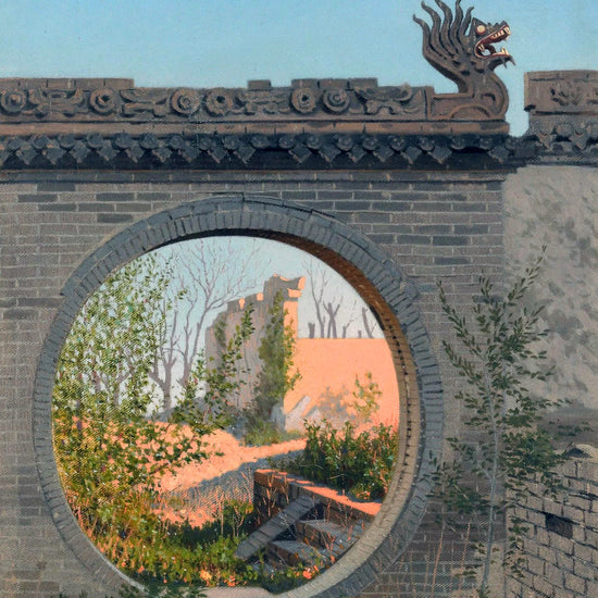 A Garden Gate in Chuguchak (1870) by Vasily Vereshchagin depicts a circular moon gate set in a brick wall crowned with traditional Chinese roof tiles and a dragon ornament. Through the opening, overgrown greenery and the silhouette of crumbling architecture are visible, bathed in warm light. The work blends architectural detail with a sense of quiet decay, capturing both cultural richness and the passage of time.