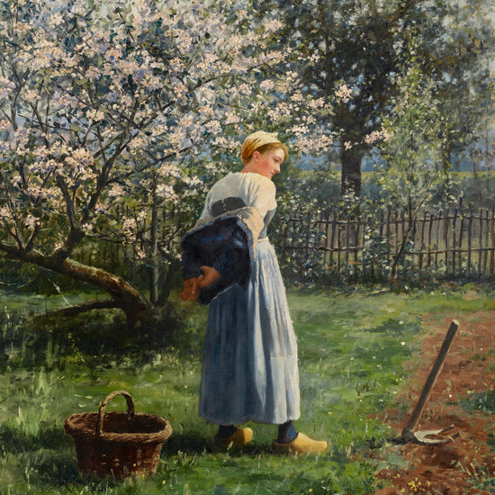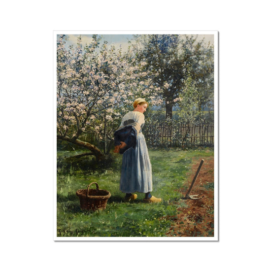 This gorgeous fine art print, "In the Orchard" by Daniel Ridgway Knight, is a peaceful scene that will add serenity and tranquil beauty to any wall. Printed with high-quality inks, this 1891 print provides a timeless feel and is sure to become a classic piece in any home.