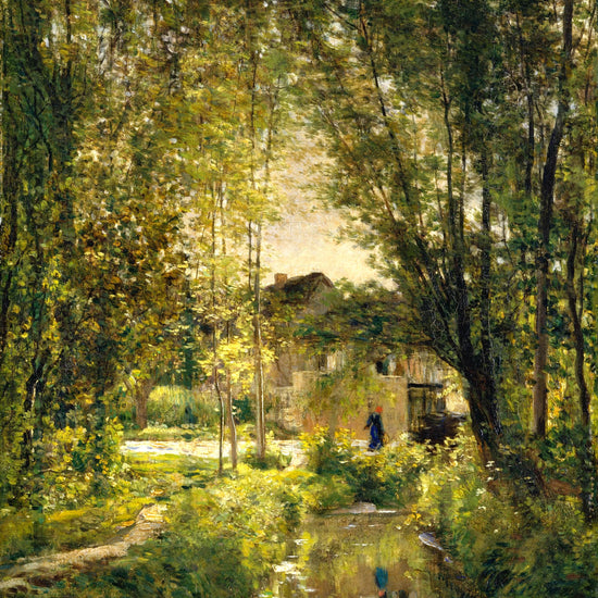 A tranquil rural scene bathed in golden light, this late work by Daubigny captures the serene harmony between water, foliage, and sunlight. The dappled reflections of trees ripple across the calm stream, leading the eye toward a cottage nestled in verdant shade. Through his delicate brushwork and luminous palette, Daubigny evokes the quiet poetry of the French countryside at the dawn of Impressionism.