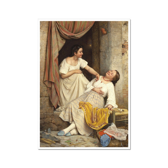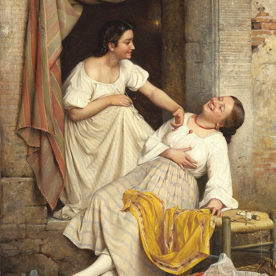 This artistic representation of two laughing girls is an oil painting by Danish artist Carl Bloch, painted in 1865. This painting captures the joy and merriment of the moment, displayed by the girls’ genuine smiles and relaxed body language. The vibrant colours and lifelike faces bring the painting to life, making it an ideal choice for any wall.