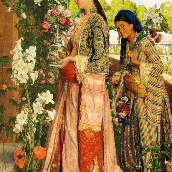 The painting "Lilium Auratum" by John Frederick Lewis, created around 1871, captures an evocative scene likely inspired by the artist's fascination with the Near East. Two women, dressed in elaborate and colorful traditional garments, are engaged in the delicate task of handling flowers. The woman in the foreground holds a richly decorated jug, carefully arranging lilies, whose Latin name "Lilium Auratum" refers to a type of golden-rayed lily of Japan, often considered highly ornamental. Her attire, ornate and flowing, suggests a level of refinement and wealth.