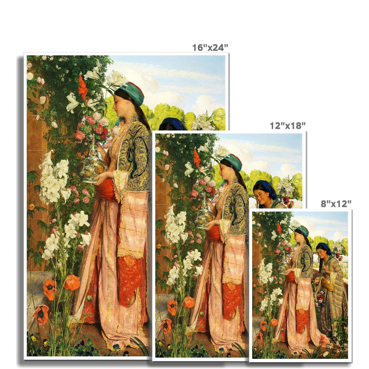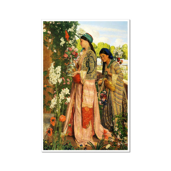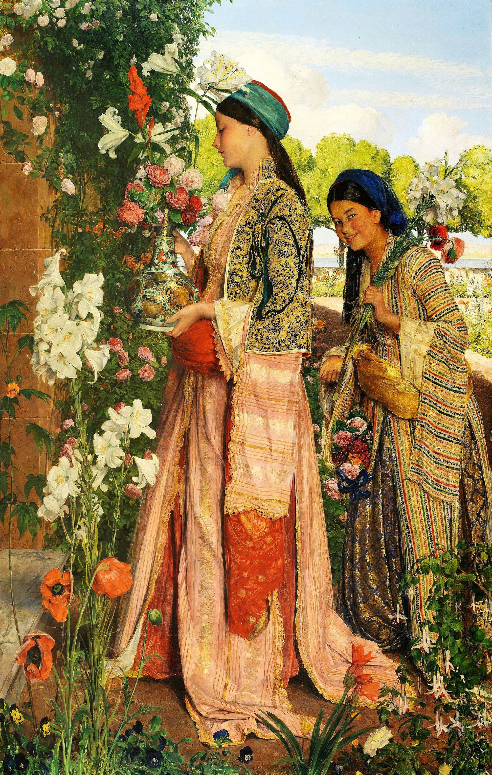 The second woman, appearing joyful and active, gathers a selection of diverse flowers into her basket, embodying a lively spirit. Both figures are enveloped in a lush garden, teeming with various species of blooming flowers, suggesting a place of serenity and natural abundance. The background reveals a landscape under bright sunlight, adding to the scene's warmth and vibrancy. Lewis’s attention to detail in the patterns of the dresses, the textures of the flowers, and the play of light throughout the composition reflects his mastery of Orientalist themes, which often romanticize the culture and aesthetics of the East. This painting is a celebration of beauty, both in the human figures and the natural world, conveying a moment of peaceful coexistence and appreciation.