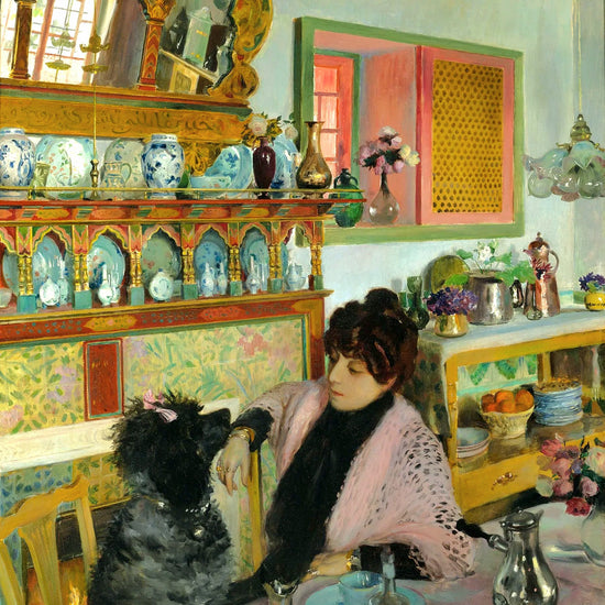 Marie Rochegrosse in the Dining Room of Djenan Meriem (1904) by Georges Rochegrosse presents a refined domestic interior infused with warmth and opulence. Set within the artist’s residence in El Biar, Algiers, the composition captures Marie Rochegrosse seated gracefully beside her poodle, surrounded by an array of Orientalist furnishings, Delft ceramics, and vibrant textiles. The meticulous rendering of light, color, and texture reveals Rochegrosse’s sensitivity to both atmosphere and decorative harmony. Blending intimate portraiture with sumptuous design, the painting exemplifies the cosmopolitan elegance and aesthetic sophistication of the Belle Époque.