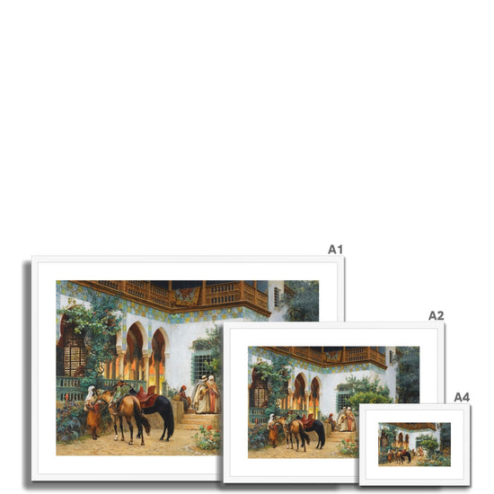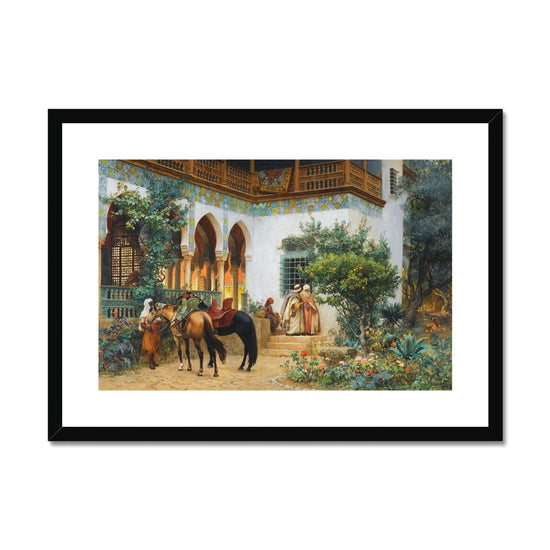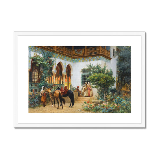 The painting "North African Courtyard" by Frederick Arthur Bridgman, dated approximately 1879, portrays a serene courtyard scene. In the foreground, a man on horseback, garbed in traditional North African attire, is presumably in conversation with another figure who appears to be greeting him or providing assistance. The courtyard is richly decorated with Moorish architectural elements, including arched doorways and a balcony with intricate wooden railings. The walls are adorned with tiles and ornamental details, characteristic of North African design. Lush vegetation, including a citrus tree, rose bushes, and various potted plants, adds to the ambiance of a peaceful, private space. A second horse, saddled and unmounted, stands to the side, while in the background, another individual engages in a task beside the entrance. The scene is set under a clear sky, suggesting a tranquil moment in the daily life of the courtyard's inhabitants.