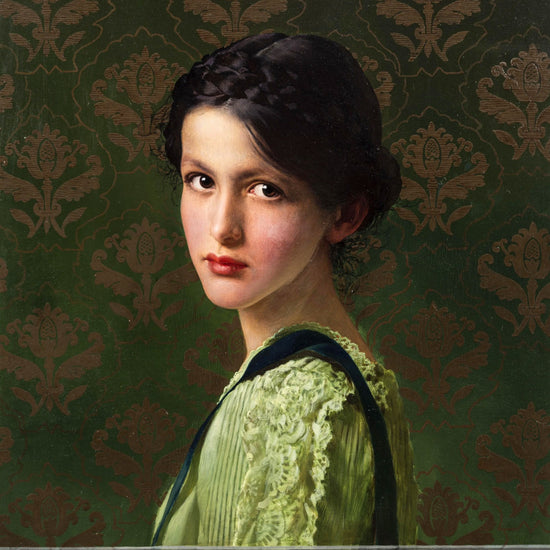 Portrait of Paolina Clelia Silvia Bondi (1909) by Vittorio Matteo Corcos exemplifies the artist’s refined realism and psychological insight. Set against a richly patterned green backdrop, the young sitter is captured with luminous precision—her composed gaze and subtly flushed complexion revealing both innocence and quiet self-awareness. Corcos’s meticulous rendering of texture and light, particularly in the lace and silk of her dress, reflects his mastery of late 19th-century portraiture while hinting at the emerging modern sensibility of early 20th-century Italy.
