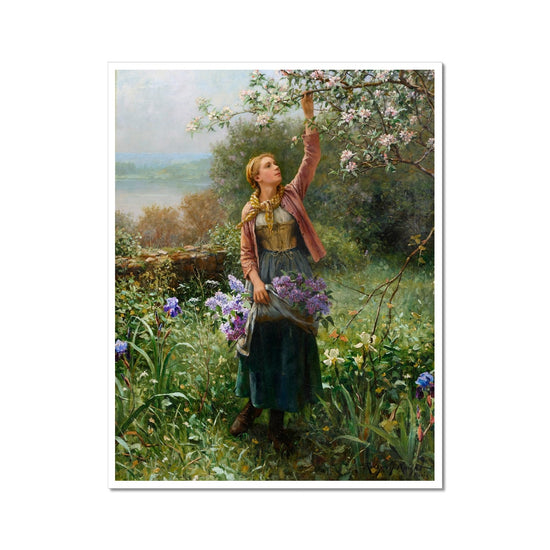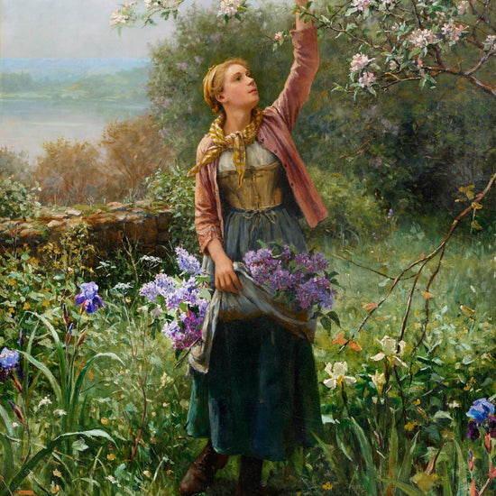 Picking Blossoms by Daniel Ridgway Knight was produced in 1902. This fine art print showcases a serene and peaceful scene of a woman picking flowers, perfectly capturing the tranquil beauty of the moment. Enjoy this peaceful masterpiece in your own home.