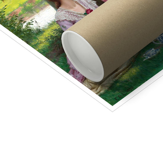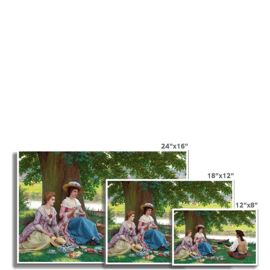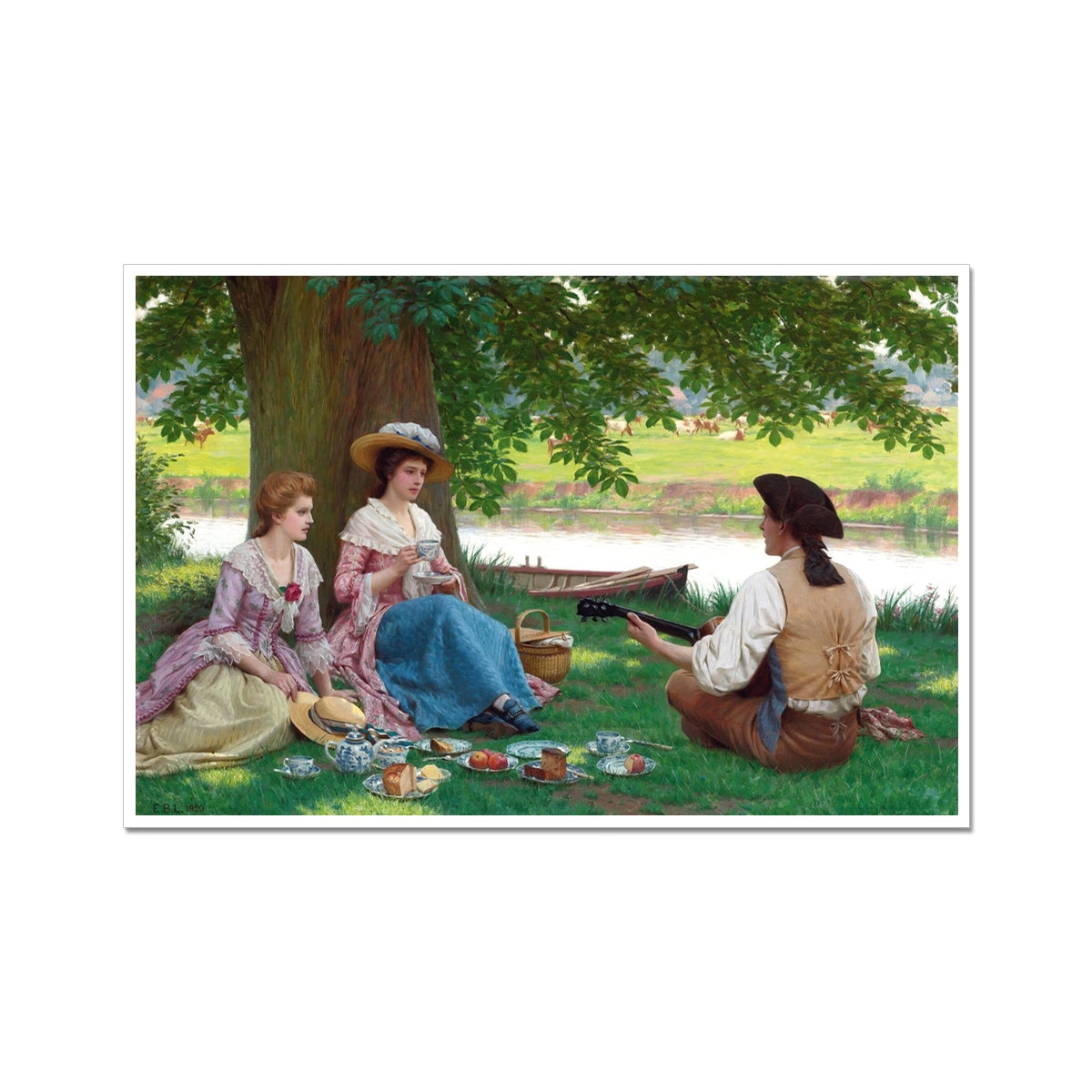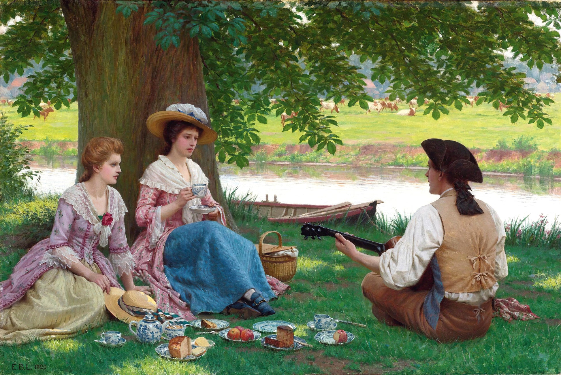 "Picnic Party" (1920) by Edmund Leighton captures a serene and idyllic scene of a leisurely outdoor gathering beside a tranquil river. Three figures are present: two young women, elegantly dressed in pastel-colored Victorian dresses with lace details, and a young man, seated opposite them, playing a guitar. The women are enjoying tea and the company of the musician, who wears a traditional vest and tricorn hat. The background shows lush green fields, trees, and a calm river with a small boat, enhancing the peaceful, romantic atmosphere. Leighton’s attention to detail, from the delicate teacups to the dappled sunlight filtering through the trees, emphasizes the timeless elegance and leisurely charm of the scene.