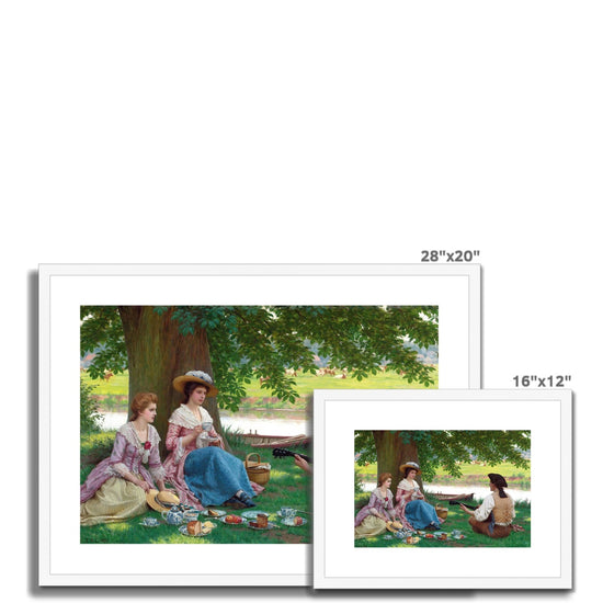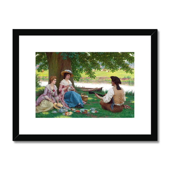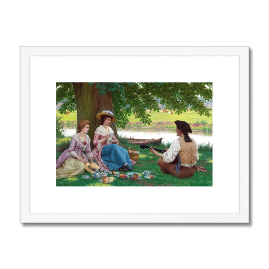 "Picnic Party" (1920) by Edmund Leighton captures a serene and idyllic scene of a leisurely outdoor gathering beside a tranquil river. Three figures are present: two young women, elegantly dressed in pastel-coloured Victorian dresses with lace details, and a young man, seated opposite them, playing a guitar. The women are enjoying tea and the company of the musician, who wears a traditional vest and tricorn hat. The background shows lush green fields, trees, and a calm river with a small boat, enhancing the peaceful, romantic atmosphere. Leighton’s attention to detail, from the delicate teacups to the dappled sunlight filtering through the trees, emphasizes the timeless elegance and leisurely charm of the scene.