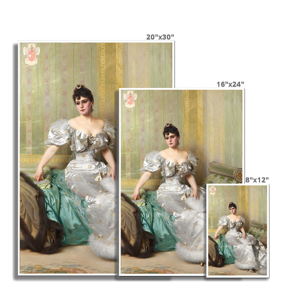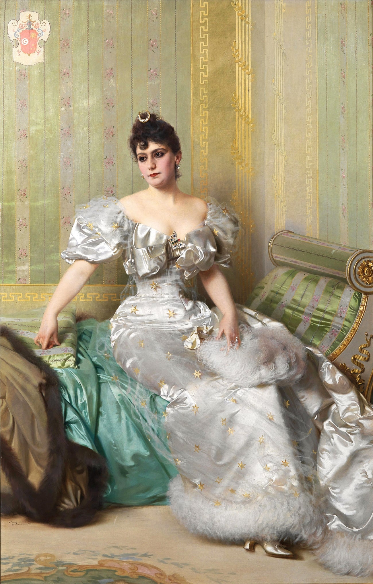 The "Portrait of Corinna Salmon" by Vittorio Matteo Corcos, circa 1893, shows an elegantly attired woman in a richly decorated room. She wears a luxurious silver gown adorned with gold stars and white fur, suggesting a sense of opulence and fashion of the late 19th century. Her poised demeanour and direct gaze convey confidence, while the intricate details of her dress and the ornate room furnishings reflect the grandeur of the era.