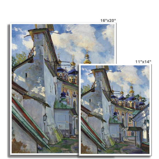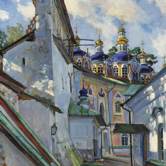 This 1928 print by Sergey Vinogradov features the Belfry and Cupola of the Uspensky Cathedral of the Pskovo-Pechersky Monastery. The details of this painting reveal the distinctive feature of the Monastery while providing a glimpse into the past.