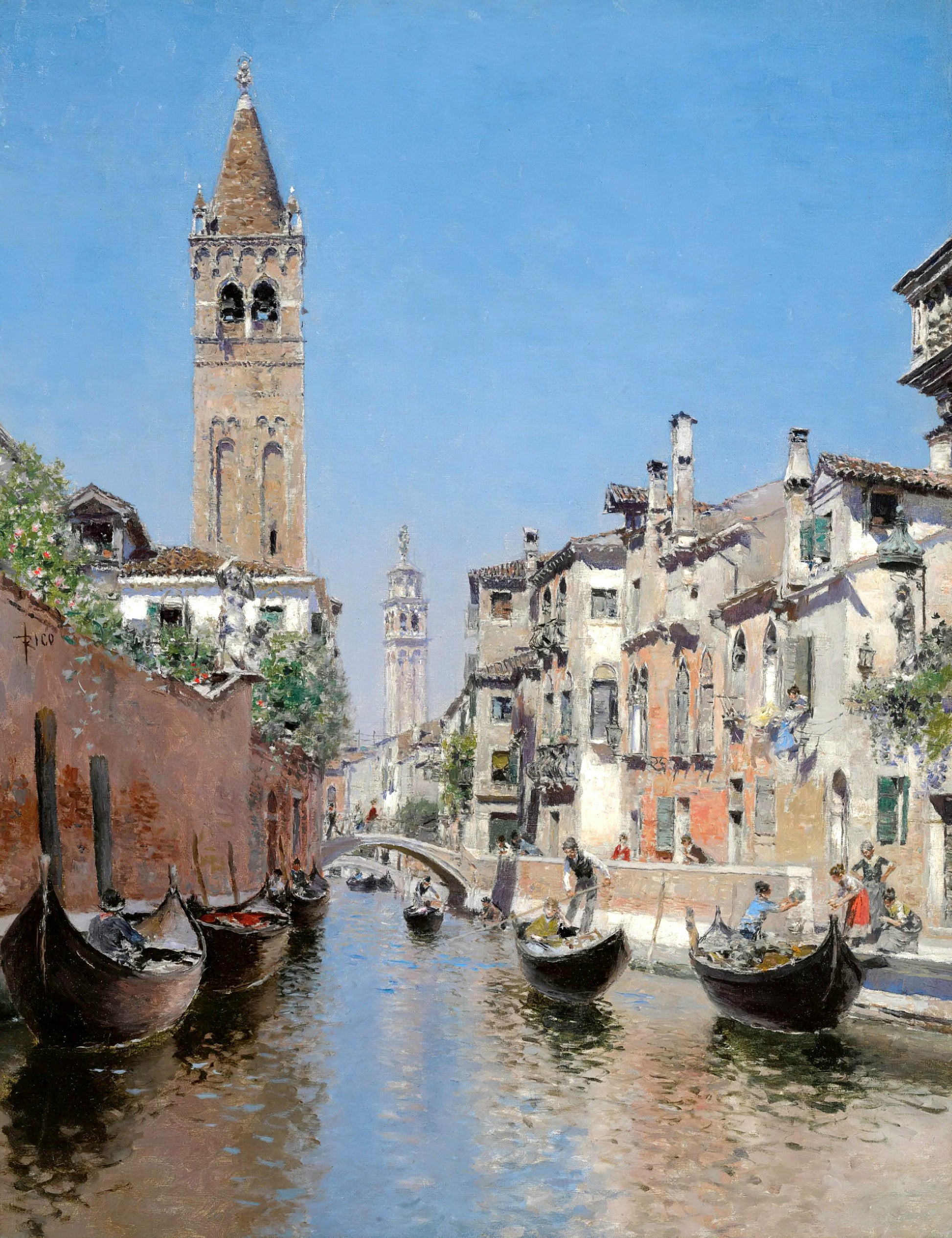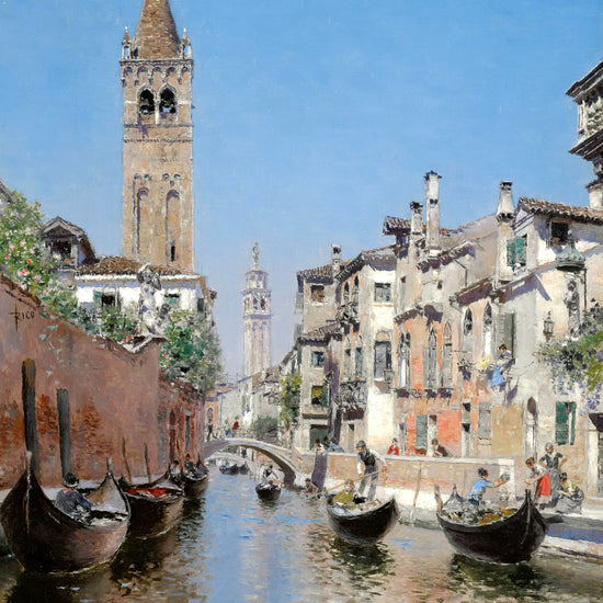 In this luminous Venetian scene, Martín Rico y Ortega (1833-1908) captures the tranquil rhythm of daily life along the Rio di San Barnaba. Bathed in brilliant sunlight, gondolas glide gently between weathered facades and beneath slender bridges, their reflections shimmering across the canal’s surface. Rico’s precise brushwork and radiant palette convey both architectural harmony and the vibrant serenity of Venice at its most poetic.