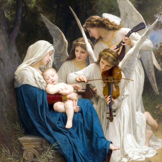 This painting by William-Adolphe Bouguereau (French, 1825–1905) exemplifies his mastery of academic realism and devotional themes. Depicting the Virgin Mary tenderly holding the sleeping Christ Child, the scene is enriched by a group of angels offering a celestial serenade with violin, lute, and hymnal. Bouguereau’s luminous brushwork, delicate modeling of flesh, and meticulous rendering of drapery imbue the composition with both serenity and reverence, embodying the artist’s blend of technical precision and spiritual idealism.