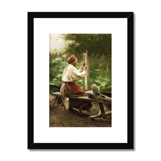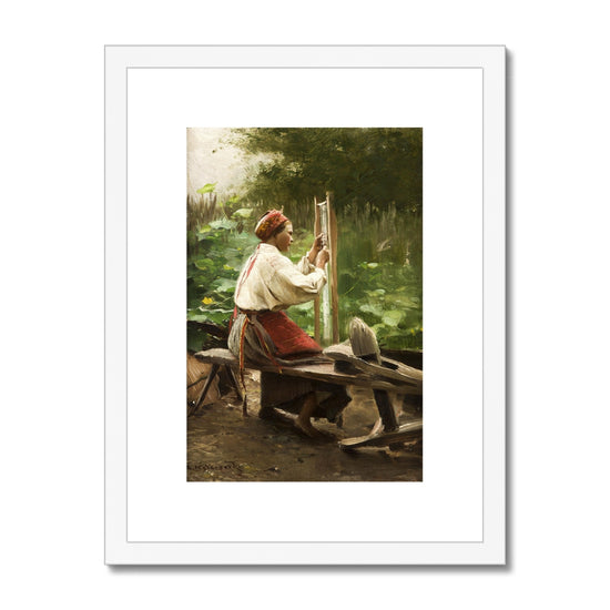 The painting "Spinner" by Apoloniusz Kędzierski, created around 1900, depicts a rural scene where a woman is engaged in spinning thread. She is seated outdoors on a wooden bench, surrounded by lush greenery, wearing traditional attire with a red apron and headscarf. The painting captures a moment of quiet labor with a focus on the naturalistic details of her clothing and the serene environment, characteristic of Kędzierski's genre scenes that celebrate rural life.