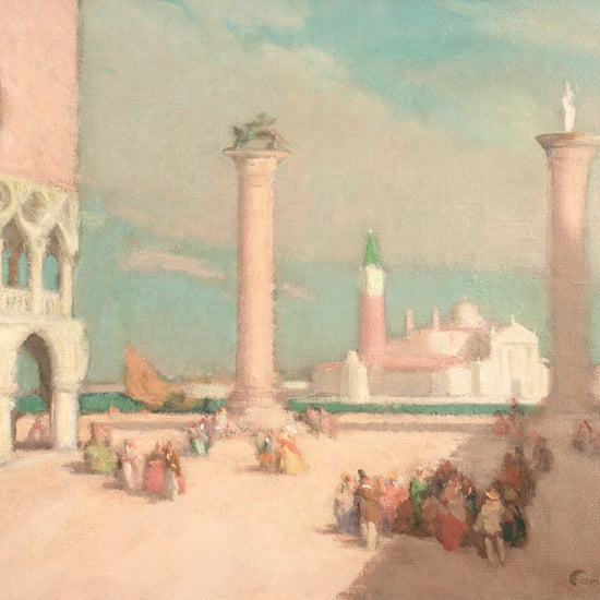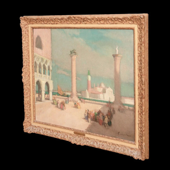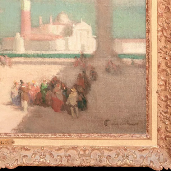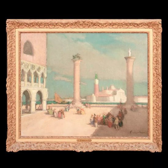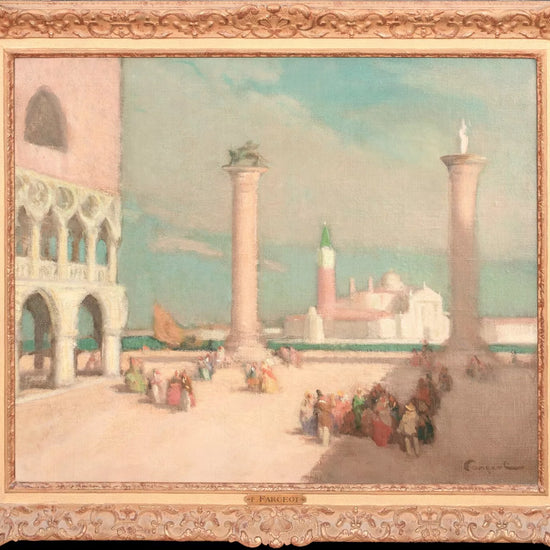 A large and vibrant early 20th century view of St Mark’s Square, Venice, by Ferdinand Fargeot (1880 - 1957) . Painted with the lively brushwork and luminous palette characteristic of the French Post-Impressionists, the scene captures the sunlit expanse of the piazza enlivened by elegantly rendered figures. This is an excellent example of Fargeot’s Venetian work, retaining strong colour, clarity, and surface condition throughout.
