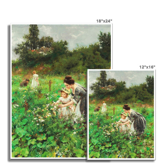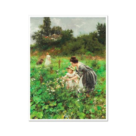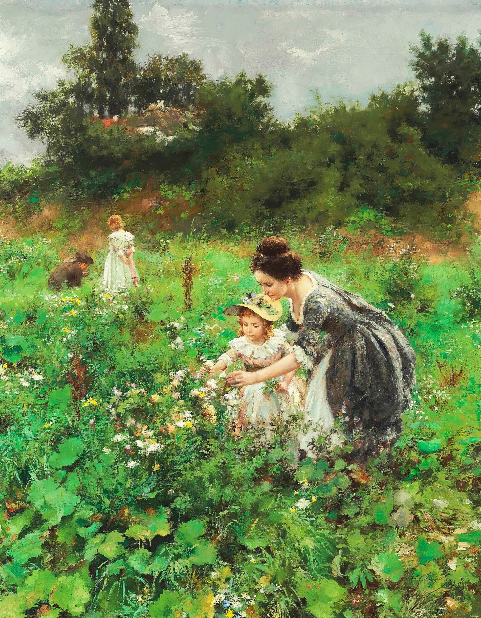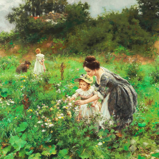 The painting "Summer’s Delight" by Hermann Seeger, created around 1899, depicts a serene, bucolic scene. In the foreground, a woman in a dark dress kneels beside a young girl wearing a light dress with a straw hat, both engaged in picking flowers. The woman is showing something in the palm of her hand to the child, who looks on with interest. The background features another figure in the distance, seemingly occupied with the landscape, while a dog accompanies her. The setting is lush and green, filled with a variety of vegetation and flowers, suggesting a rich, summer garden. The brushwork is loose and impressionistic, capturing the vibrancy and light of a summer day.