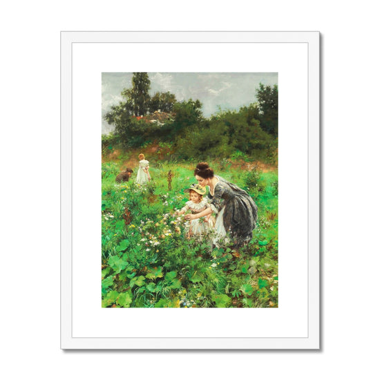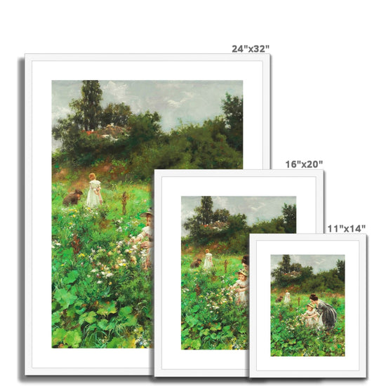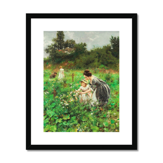 The painting "Summer’s Delight" by Hermann Seeger, created around 1899, depicts a serene, bucolic scene. In the foreground, a woman in a dark dress kneels beside a young girl wearing a light dress with a straw hat, both engaged in picking flowers. The woman is showing something in the palm of her hand to the child, who looks on with interest. The background features another figure in the distance, seemingly occupied with the landscape, while a dog accompanies her. The setting is lush and green, filled with a variety of vegetation and flowers, suggesting a rich, summer garden. The brushwork is loose and impressionistic, capturing the vibrancy and light of a summer day.