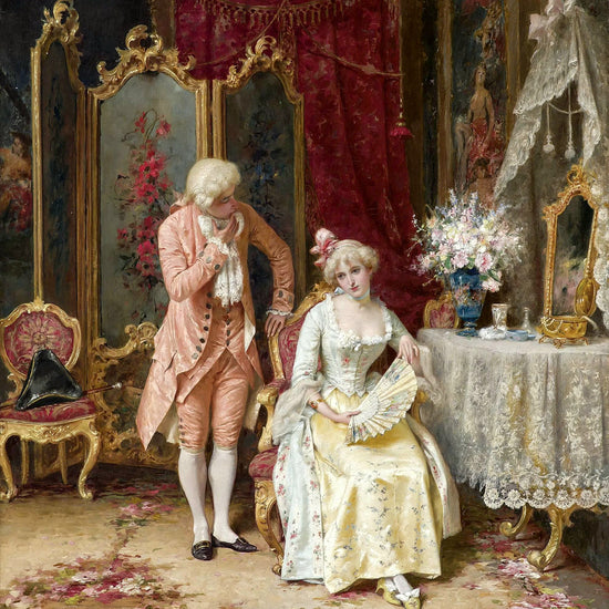 Set within an opulent Rococo interior, The Admirer captures a moment of refined courtship between an elegantly dressed couple. The seated lady, poised yet demure behind her fan, listens to her suitor’s entreaties amid lavish furnishings, gilded mirrors, and cascading silks. Attanasio’s meticulous attention to texture and ornament, combined with his soft, luminous palette, evokes the grace, elegance, and subtle tension of romantic intrigue in fin-de-siècle historical painting.